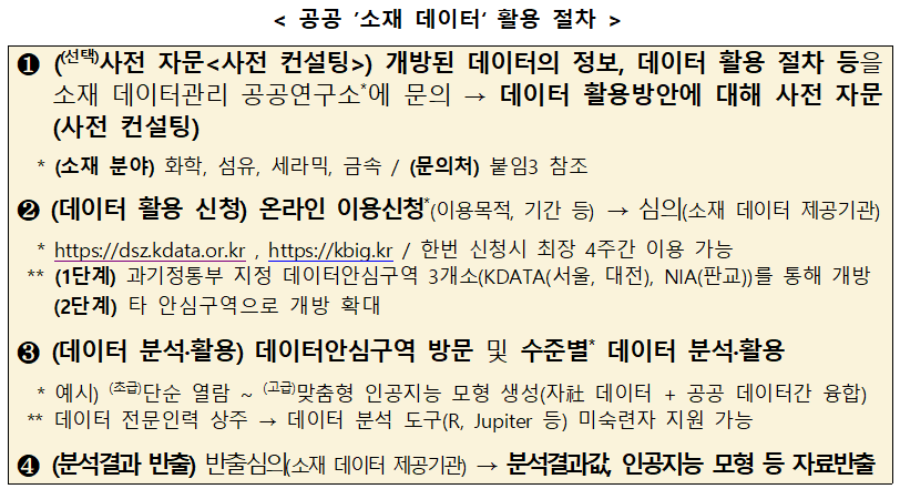 산업부는 2020년부터 국내 소재 산업의 경쟁력 강화와 전략 소재 선점을 지원하기 위해 화학, 금속, 세라믹, 섬유 등 4개 소재 분야 공공 데이터를 축적해왔으며, 이번 협약을 계기로 약 300만건의 소재 데이터를 국민 누구나 접근 가능하도록 개방하게 된다. 원료, 조성, 공정에 따른 다양한 소재 특성을 담은 실험 데이터를 통해 국내 소재 기업들의 연구개발 성공률을 제고하고 데이터 기반 창업도 촉진할 전망이다.