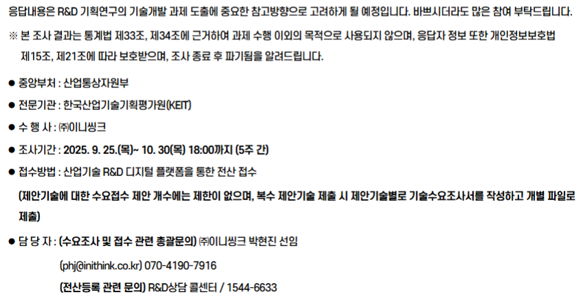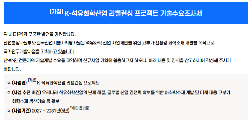 September 26, 2025 공고기관 한국산업기술기획평가원 수요조사마감일 2025-10-30(목) 18:00 링크 https://srome.keit.re.kr/srome/biz/perform/opnnPrpsl/retrieveRndPlnnDtlView.do?… 첨부파일 (양식) K-석유화학산업 리밸런싱 프로젝트 기술수요조사서.hwp (78.5 KB) 별첨1. (가칭)K-석유화학산업 리밸런싱 프로젝트 사업개요.hwp (54.5 KB) 내용