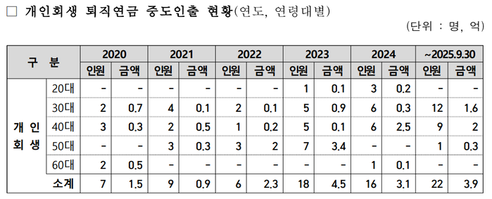 올해는 현재까지 집계된 40대 이하 과학기술인의 개인회생을 위한 퇴직연금 중도인출만 21명(3억 6000만원)으로 전년도 수준을 넘었다. 이 중 30대 청년 과학기술인은 12명(1억 6000만원)을 차지했다. 또 지난해에는 개인회생으로 퇴직연금을 깬 20대 과학기술인 사례도 3명에 달했다.