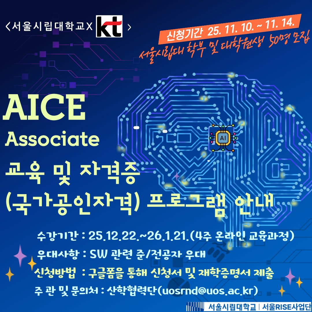 서울 RISE사업과 관련하여 산학협력단에서는 서울시립대학교 재학생을 대상으로「AICE Associate 교육 및 자격증(국가공인자격) 프로그램 수강생」을 다음과 같이 모집합니다.