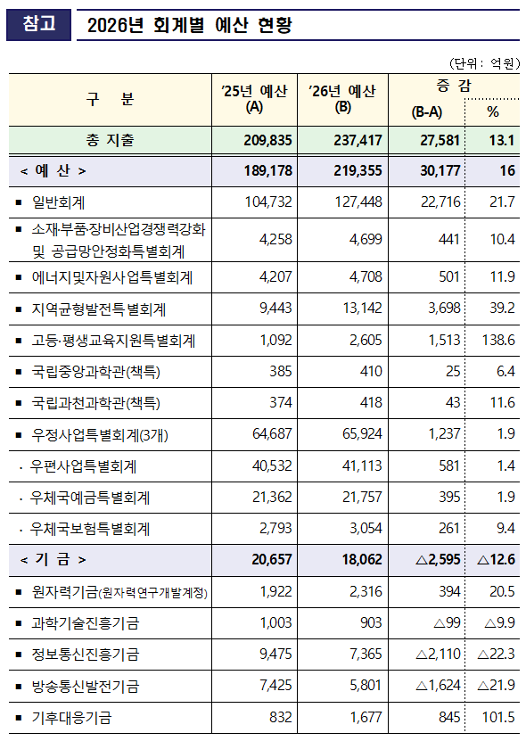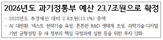 과학기술정보통신부(부총리 겸 과기정통부 장관 배경훈, 이하 ‘과기정통부’)는 정부안 대비 746억원 증액된 총 23조 7,417억원 규모의 과기정통부 2026년도 정부 예산 및 기금운용계획이 12.2.(화), 국회 본회의 의결을 통해 최종 확정됐다고 밝혔다.