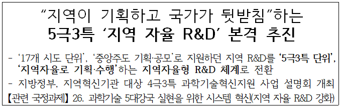 과학기술정보통신부(부총리 겸 과기정통부 장관 배경훈, 이하 ‘과기정통부’)는 국정과제(지역 자율 R&D 강화)에 따라, 기존 ‘17개 시·도 단위, 중앙주도’로 추진해 온 지역 연구개발(R&D) 지원체계를 ‘5극3특 단위, 지역자율형 R&D’ 체계로 전환하고, 이를 본격 추진한다고 밝혔다.