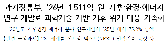 과학기술정보통신부(부총리 겸 과기정통부 장관 배경훈, 이하 ‘과기정통부’)는 수소에너지, 이산화탄소 포집·활용(CCU*), 태양전지, 기후 적응 등 기후변화대응 기술개발에 총 1,511억 원을 투자하는 「2026년도 과기정통부 기후·환경 연구 개발사업 시행계획」을 확정**하고, 본격적으로 사업을 추진한다고 밝혔다.