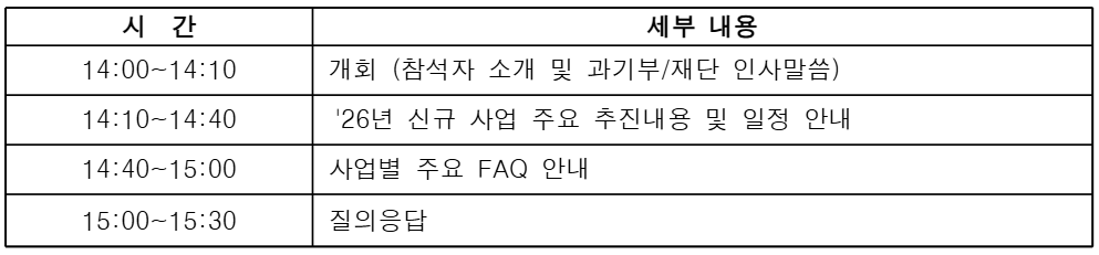 - (주요 내용) '26년 신규 사업 설명 및 사업별 주요 FAQ 안내