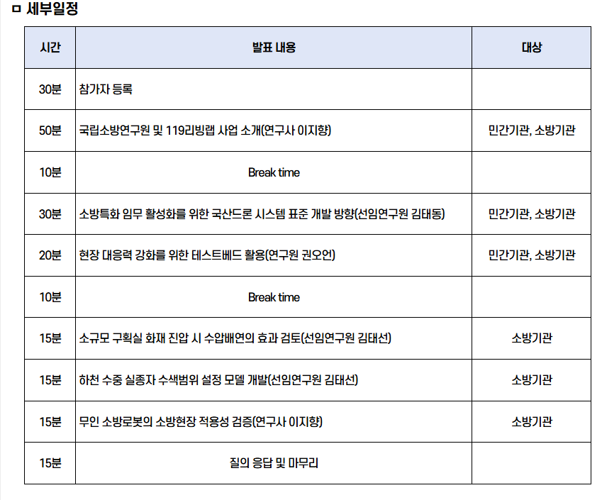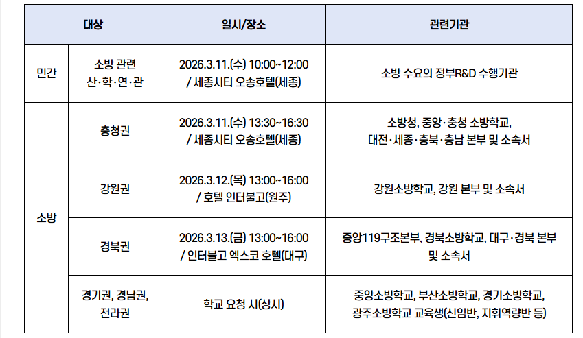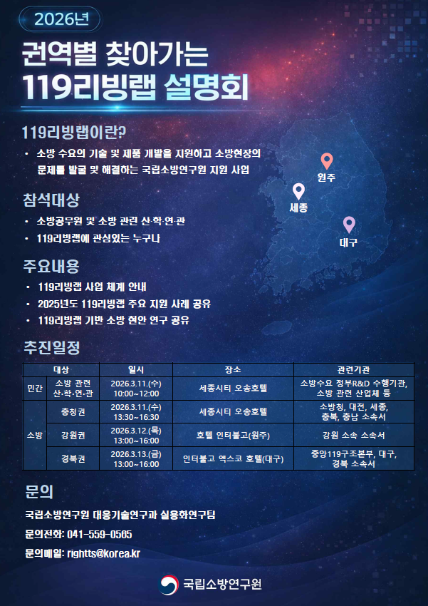 February 24, 2026 2차분류 안내 분류 연구과제 ※참석 희망자는 2026.2.25.(수)까지 공문(대응기술연구과) 또는 이메일(rightts@korea.kr) 회신 후 참석(담당자 : 선임연구원 김태선, 041-559-0565) 붙임 1. 2026년 119리빙랩 사업 설명서 개최 계획 2. 119리빙랩 설명회 포스터 3. 2025년 119리빙랩 성과집 첨부파일 2026년 119리빙랩 사업 설명회 개최 계획(외부).hwp (848.5 KB) 포스터.pdf (321.72 KB) 성과집.pdf (12.93 MB)