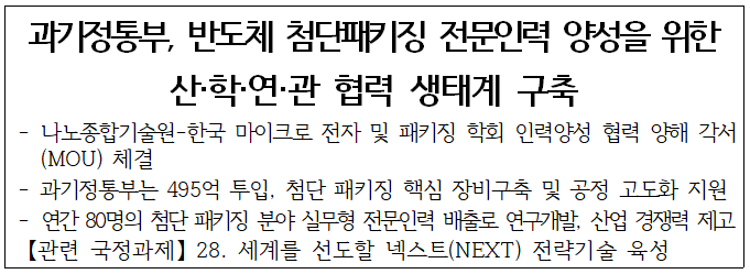 과학기술정보통신부(부총리 겸 과기정통부 장관 배경훈, 이하 ‘과기정통부’)는 인공지능(AI) 반도체 시대를 선도할 핵심 기술인 반도체 첨단패키징* 분야의 전문 인력 양성을 국가 기반 시설(인프라) 고도화와 연계하여 본격 추진한다고 밝혔다.