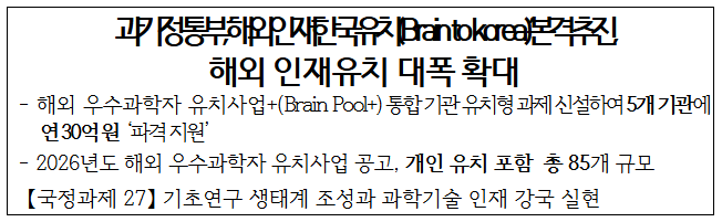 과학기술정보통신부(부총리 겸 과기정통부 장관 배경훈, 이하 ‘과기정통부’)는 국정과제27 ‘기초연구 생태계 조성과 과학기술 인재 강국 실현’ 내 ‘해외 인재 한국 유치(Brain to Korea)’(2030년까지 세계적 인재 2,000명 유치)를 차질 없이 추진하고, 국제적인 연구경쟁력을 획기적으로 강화하기 위해 「2026년도 해외 우수과학자 유치사업(BP/BP+)」 신규 과제 선정계획을 공고했다고 밝혔다.