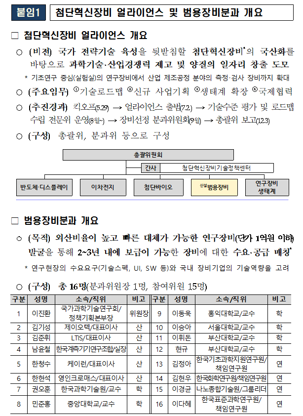 붙임 1. 첨단 혁신 장비 협력체(얼라이언스) 및 범용 장비분과 개요