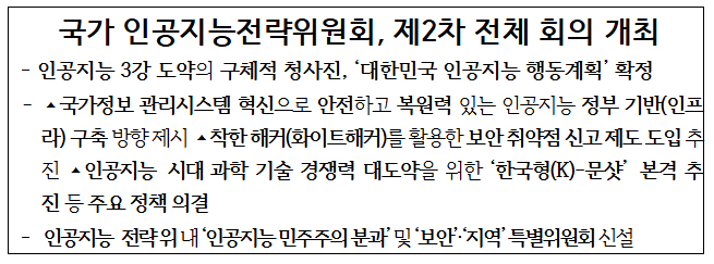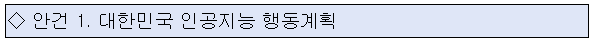 * ‘인공지능 3대 강국 도약’ 미래상(비전) 달성을 위한 ➊인공지능 혁신생태계 조성 ➋범국가 인공지능 기반 대전환 ➌국제 인공지능 기본사회 기여라는 3대 정책축과 이를 뒷받침하는 12대 전략 분야