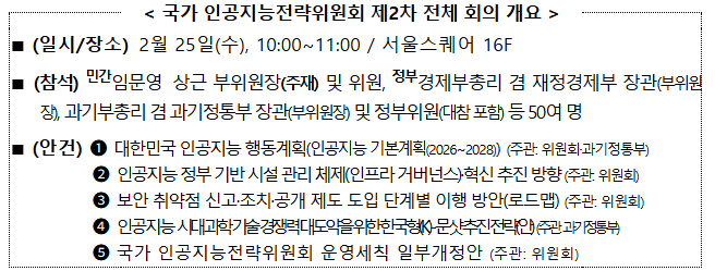 국가 인공지능전략위원회(위원장 이재명 대통령, 이하 2월 25일(수) 10시, 위원회가 위치한 서울스퀘어(16층)에서 제2차 전체 회의를 개최했다고 밝혔다. 회의는 입문용 상근 부위원장이 주재하였으며, 정부·민간 위원 및 관계 부처 등 50여 명이 참석한 가운데, ‘대한민국 인공지능 행동계획(인공지능 기본계획)’을 포함한 총 5개의 안건을 심의·의결하였다.
