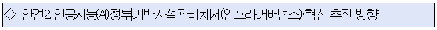 과학기술부총리 산하에 관계 부처 합동으로 인공지능 정부 기반 시설(인프라) 총괄 전담 조직(가칭인공지능 정부 기반 시설 관리 체제(인프라 거버넌스)‧혁신 추진단)을 신설하여, 공공 정보시스템 구축‧운영의 적정성을 검토하고, 영국 정부 디지털청(GDS) 등 해외사례를 참고한 중장기 관리 체제(거버넌스) 재설계 방안도 마련할 예정이다.