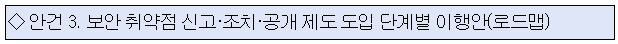 제3호 안건으로는 “기존 사후 대응 중심의 국내 정보보안 인식 체계(패러다임)를 사전 예방으로 전환”하기 위해 “착한 해커(화이트해커)가 기업·기관의 보안 취약점을 상시로 찾아 신고하고, 피신고 기관은 신고된 취약점을 조치하며 그 이후 투명하게 공개함으로써 해킹 등 보안 사고를 예방”하는 ‘보안 취약점 신고·조치·공개 제도 도입 단계별 이행안(로드맵)’을 심의·의결하였다.
