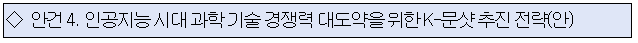 제4호 안건으로는 인공지능 기반 과학 인식 체계(패러다임)로의 전환을 우리나라가 세계 과학 기술 선도 국가로 대도약 하는 기회로 활용하기 위한「인공지능 시대 과학 기술 경쟁력 대도약을 위한 K-문샷 추진 전략(안)」을 심의·의결하였다.