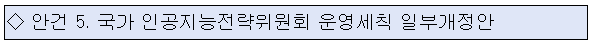 제5호 안건으로는 인공지능 기본법 시행(’26.1.22)에 따라 법정 위원회로 전환된 위원회가 강화된 역할을 효율적으로 수행하기 위해 분과/전담반(TF) 등 내부 조직을 개편하는 내용 등을 담은 ‘국가 인공지능전략위원회 운영세칙 일부개정안’을 의결하였다.