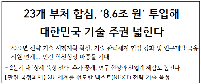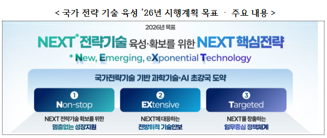 급변하는 대내외 정세에 대응하기 위해 기술·산업 사고체계(패러다임) 전환과 주요국 정책 변화를 반영하여 국가 전략 기술 체계를 고도화한다. ▲인공지능 전환 선도, ▲통상·안보 주도권 확보, ▲미래 혁신 기반 창출의 NEXT 전략 기술 임무(미션)(안)을 고려하여 ’26년 상반기 중 기술 체계를 개편하고, 국가 전략 기술을 확보하기 위한 전략을 세운다. 또한 연구개발 예타 폐지와 후속 사전점검제도 도입을 통해 신속하고 효율적으로 정부 연구개발을 추진하여 국제 기술경쟁력을 적시에 확보할 수 있도록 지원할 방침이다.