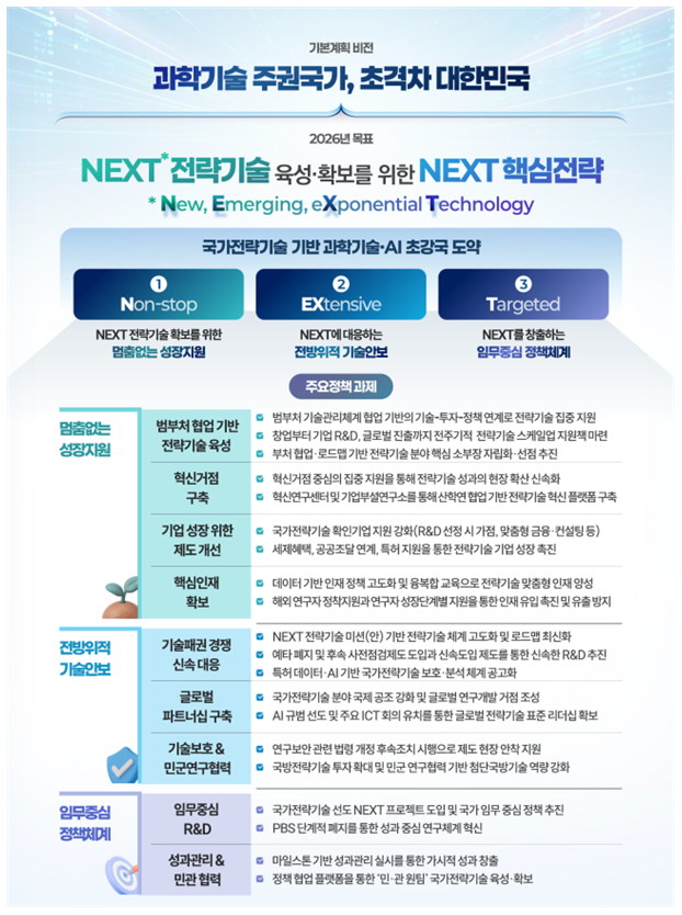 정부는 ➊ NEXT 전략 기술 확보를 위한 멈춤 없는 성장지원, ➋ NEXT에 대응하는 전방위적 기술 안보, ➌ NEXT를 창출하는 임무 중심 정책체계의 3대 핵심 목표를 중심으로 기술 주권 확보와 미래 성장동력 창출을 이끌 국가 전략 기술 육성·확보에 국가적 역량을 총결집할 계획이다.