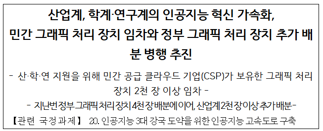 이에 더해, 첨단 그래픽 처리 장치 확보ㆍ구축 기간에 따른 시장 공백 해소와 민간 그래픽 처리 장치 서비스 시장 활성화 등을 고려하여 민간 공급 클라우드 기업(CSP)이 보유한 그래픽 처리 장치 자원을 활용하여 산·학·연에 지원하는 그래픽 처리 장치 임차 사업을 추진한다.