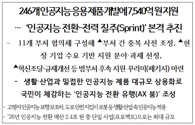 정부는 산업과 일상 전반의 인공지능 전환(AX)을 가속화하기 위해 11개 관계부처* 합동으로 ‘인공지능 응용 제품 신속 상용화 지원사업(AX 스프린트)’ 추진계획을 마련하고 3월부터 사업에 착수한다.