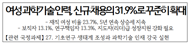 ※ 신규 채용 여성 과기인 비율 : (’20) 28.1% → (’21) 30.7% → (’22) 32.1% → (’23) 31.6% → (’24) 31.9%
