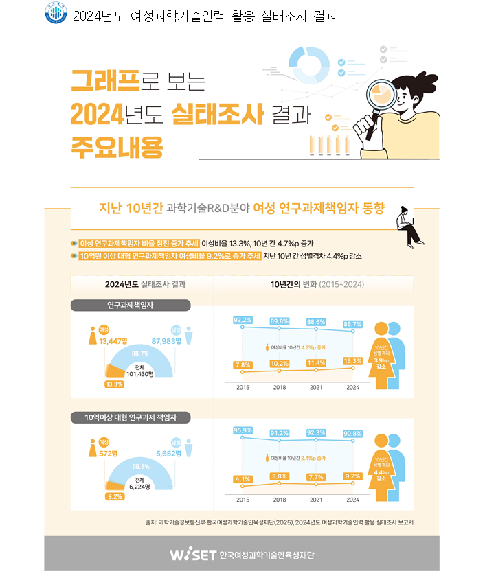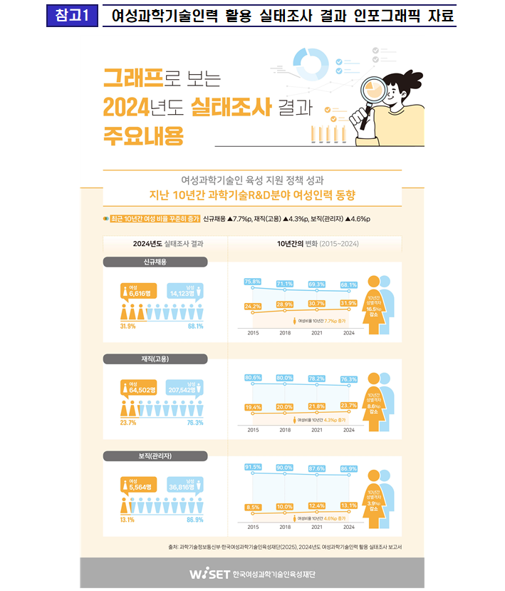 과학기술정보통신부(부총리 겸 과기정통부 장관 배경훈, 이하 ‘과기정통부’)와 한국여성과학기술인육성재단(이사장 문애리)은 전국 5,138개 과학기술 분야 연구기관의 성별 연구개발 인력 활용 현황을 종합적으로 조사·분석한 「2024년도 여성 과학기술 인력 활용 실태조사」 보고서를 발간하였다.