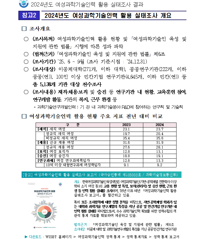 ▶ 내려받기(다운로드) : 한국 여성과학기술인 육성 재단 누리집(WISET 홈페이지) > 여성 과학기술 인력 정책·통계 > 정책·통계자료 > 정책·통계 보고서