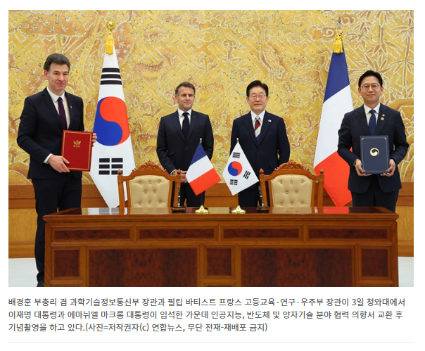대한민국과 프랑스가 인공지능(AI), 양자 등 양국의 주요 핵심전략 과학기술 분야에서 핵심 파트너임을 재확인하고 동맹을 강화하기로 했다.