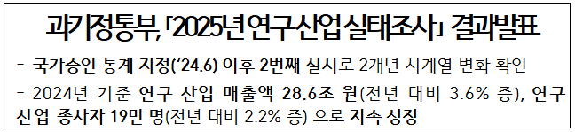 과학기술정보통신부(부총리 겸 과기정통부 장관 배경훈, 이하 과기정통부)는 국내 연구 산업의 현황을 파악하기 위해 실시한 「2025년 연구 산업 실태조사」 결과를 발표하였다.