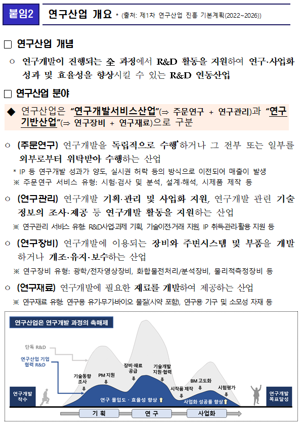 연구 산업은 연구개발 활동을 지원하는 연동산업으로, ▲연구개발 전략 수립 ▲설계·해석 ▲시험·분석 ▲시제품 제작 ▲연구 장비·재료의 개발·공급 등의 서비스를 제공하여 연구 성과 창출·활용·확산에 이바지하는 산업이다.