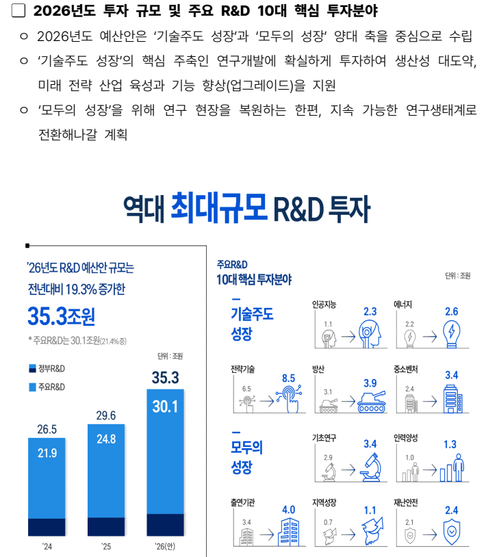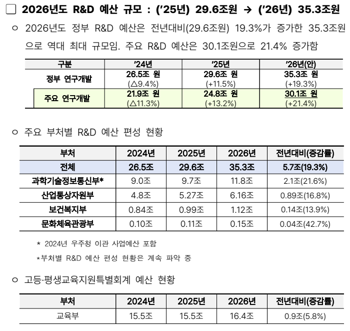 정부가 발표한 2026년도 정부 연구개발(R&D) 예산안 및 주요 부처별 주요 내용을 다음과 같이 안내드리며,